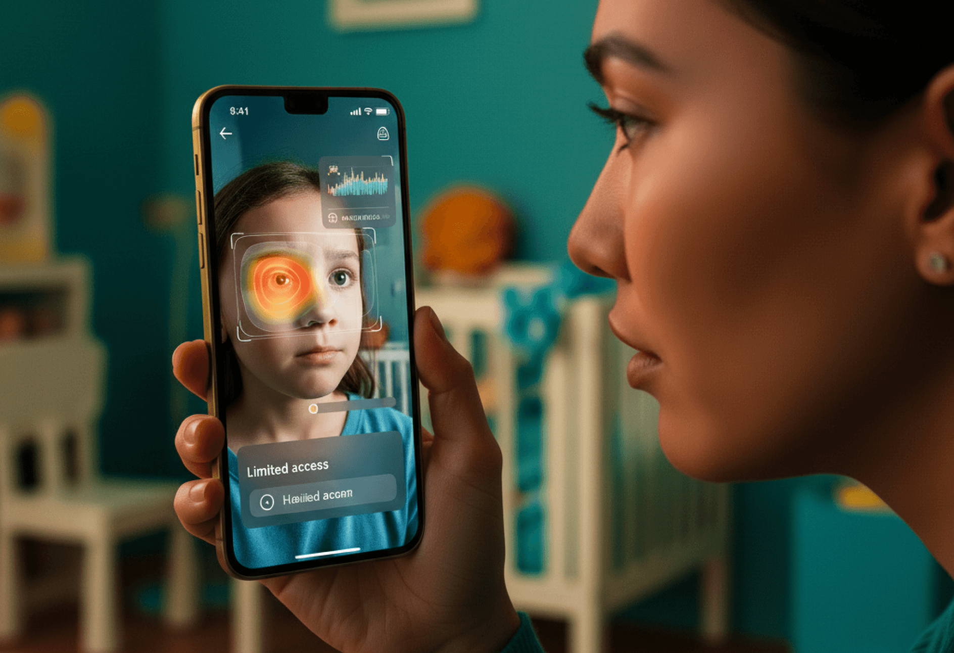 Dita's 5-year-old daughter is being examined by AI using a smartphone app, through analyzing photos. Consultations with a doctor are only available if Dita increases her insurance premium.